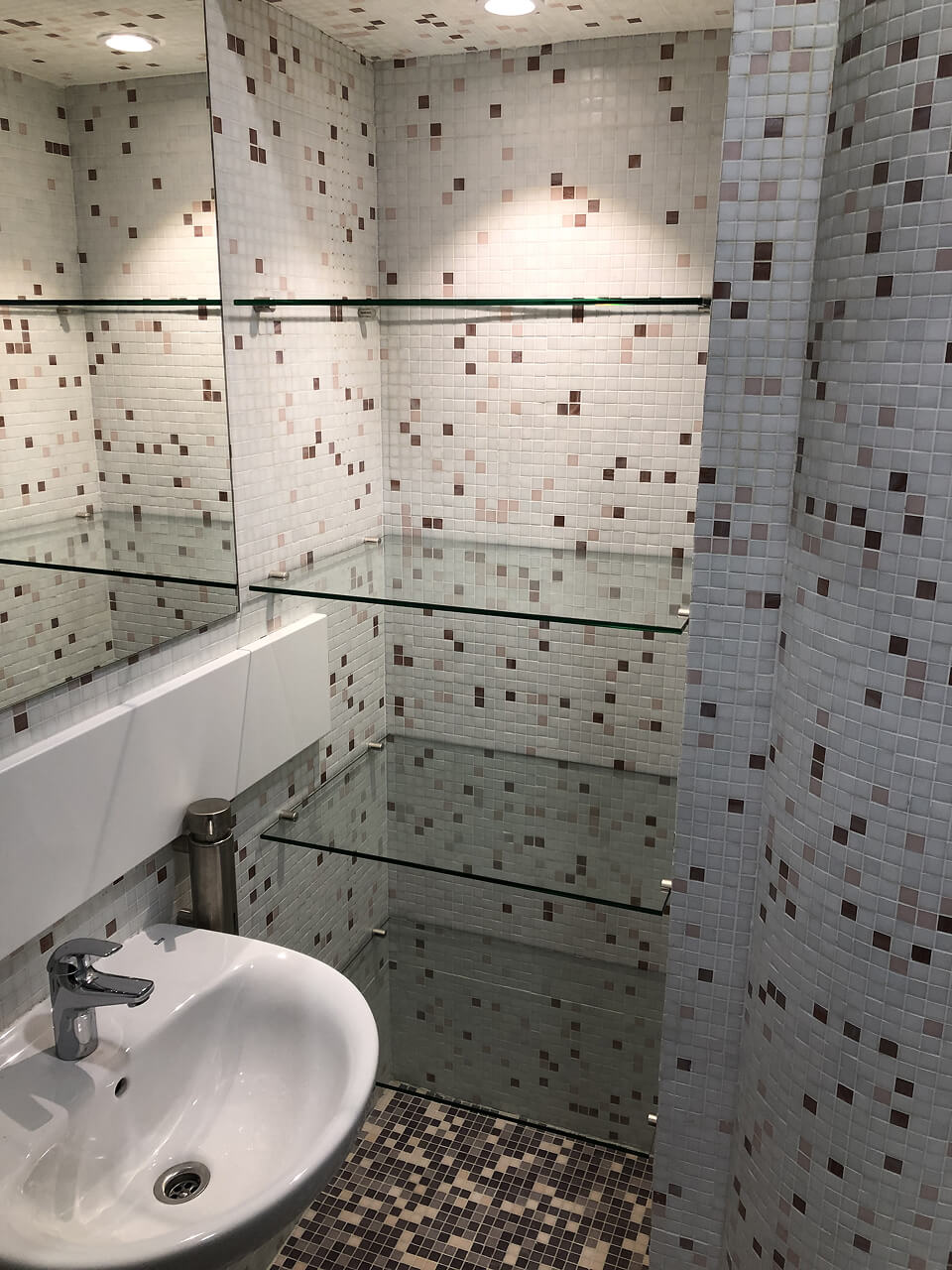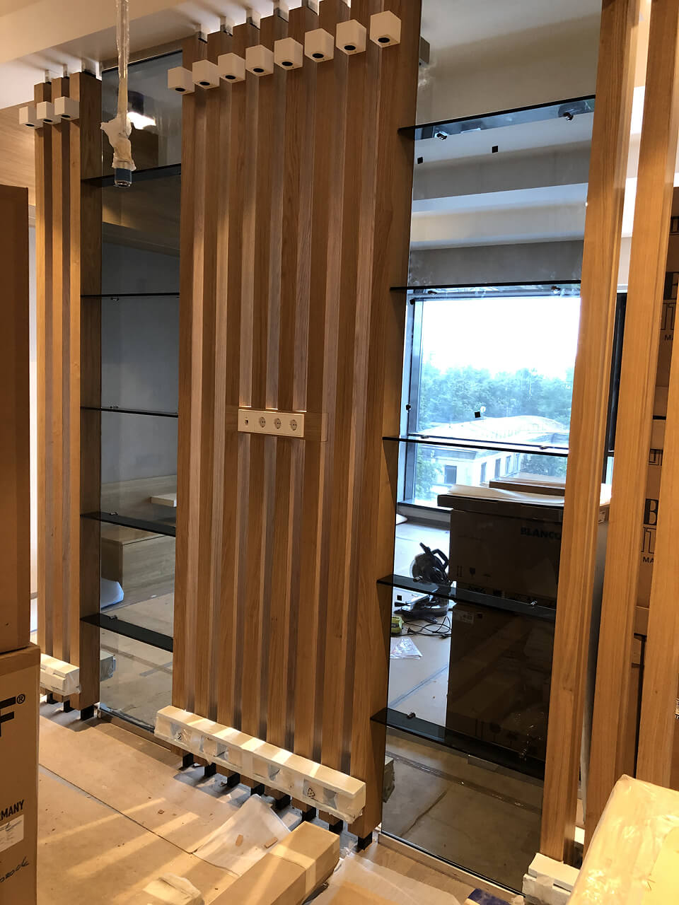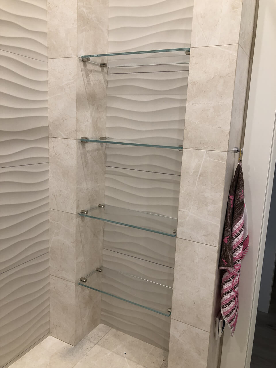– стеклянные полки обеспечивают безопасность эксплуатации. Закалённое стекло безопасно при повреждении, фурнитура и крепления тщательно рассчитаны на вес и нагрузку, а индивидуальный заказ позволяет учесть все особенности помещения, включая расположение стен, дверей, розеток и других элементов интерьера.