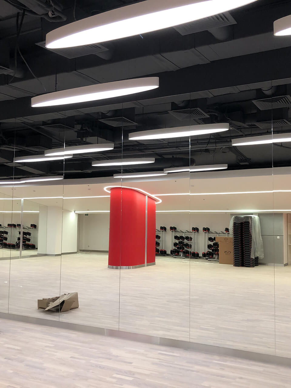 Также в спортивных залах могут применяться осветлённые зеркала, которые обеспечивают более нейтральную цветопередачу и чистоту отражения. Такие решения востребованы в пространствах с дизайнерским интерьером, где важно сохранить точные оттенки отделки, освещения и спортивного оборудования.