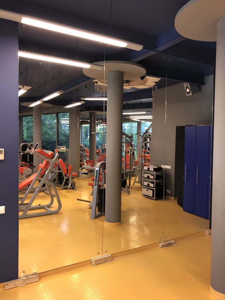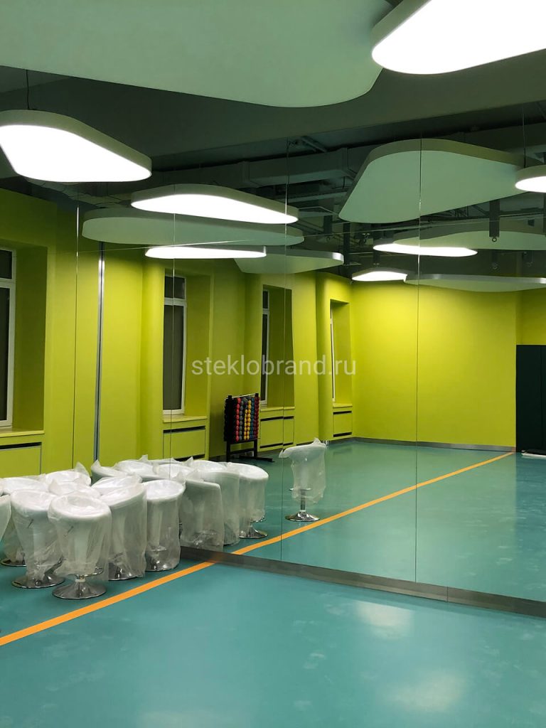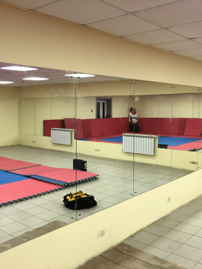 В спортивных залах зеркала устанавливаются, как правило, от уровня пола или с минимальным отступом, формируя максимально функциональную отражающую поверхность. Высота зеркал подбирается таким образом, чтобы отражение было комфортным как для индивидуальных, так и для групповых занятий. Индивидуальный подход к изготовлению позволяет учитывать специфику конкретного вида спорта или тренировочной программы.